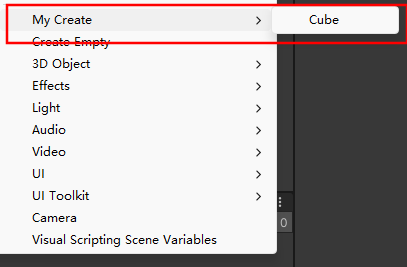 [MenuItem("GameObject/My Create/Cube", false, 0)]