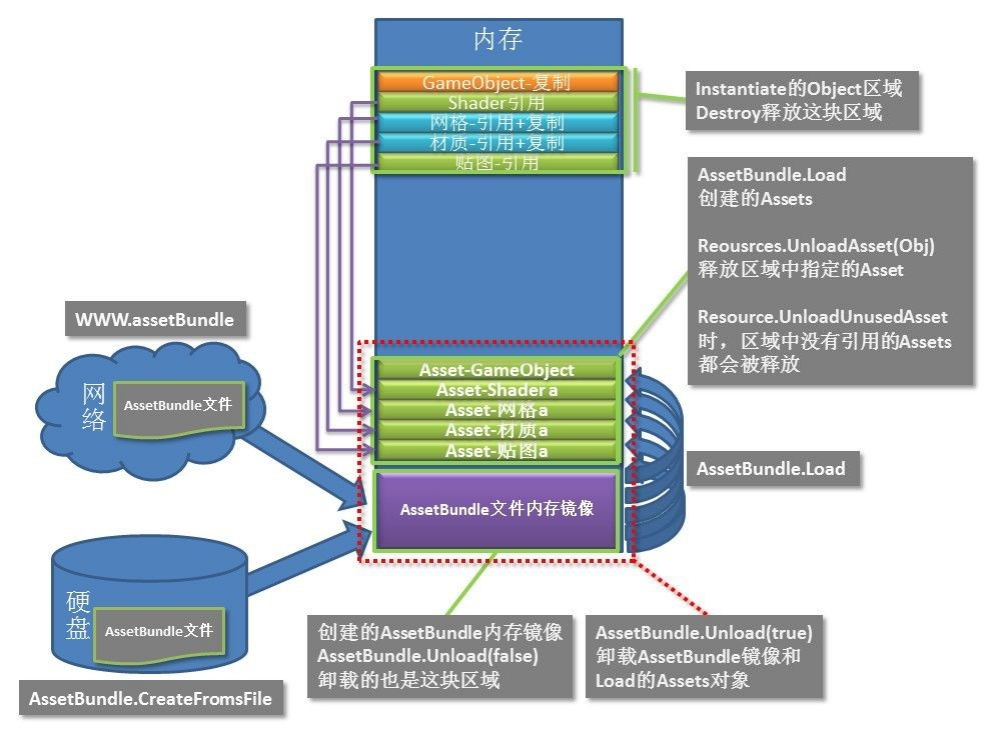 当使用Load去加载的时候,将 文件镜像内存 区域中的信息加载到 缓存区域(和Resources.Load加载资源属于同一个区域)